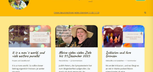 Und noch ein Wort in eigener Sache: Ich versuche ja nach und nach, alle Blogger/innen hier in einem kleinen Interview vorzustellen… Ursprünglich dachte ich, ich mach das alphabetisch nach den Blognamen. Aber damit bin ich schon lange “aus dem Tritt gekommen”…. Ich mach jetzt trotzdem mal so weiter wie bisher. Und dann starte ich einfach eine neue Runde.